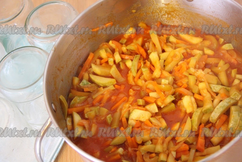 С момента закипания варить салат из кабачков на среднем огне в течение 30 минут. Не допускать сильного кипения, пусть наш салат томится. В конце варки добавить в кастрюлю уксус и хорошо перемешать. Снять кастрюлю с овощной смесью с огня.
