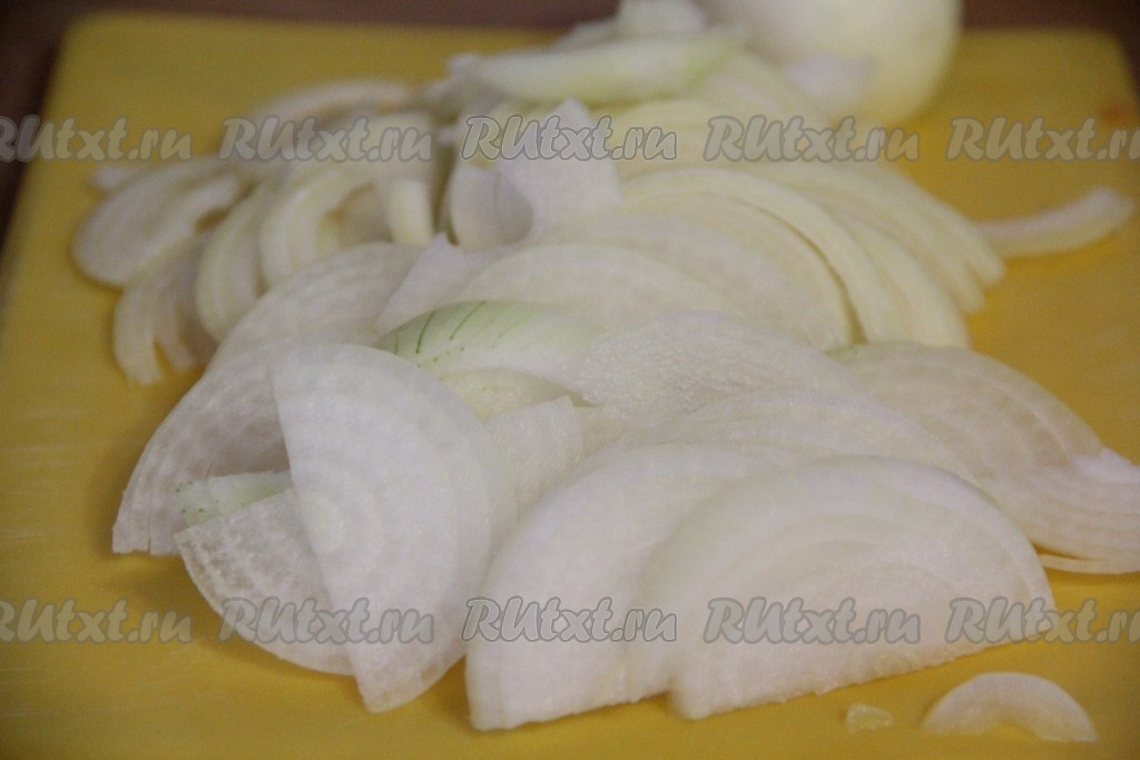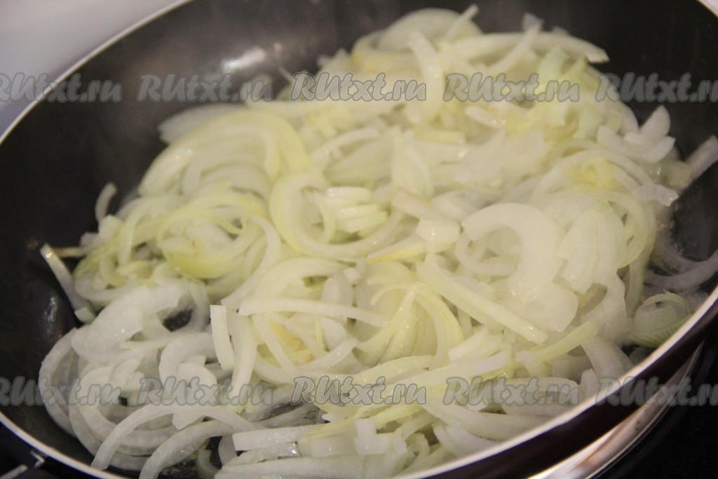В сковороду налить 50 мл растительного масла, добавить лук и обжарить, иногда помешивая, в течение нескольких минут.