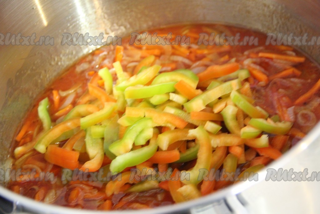 Как только томатная смесь закипит, добавить обжаренные овощи, 100 мл растительного масла. Всё хорошо перемешать.
