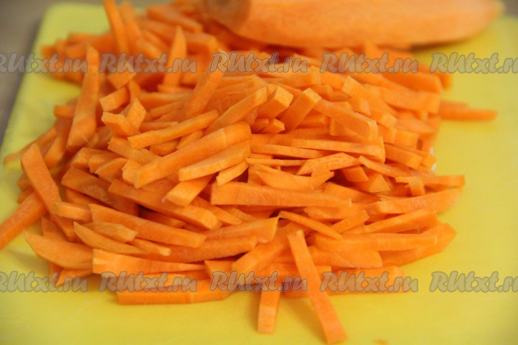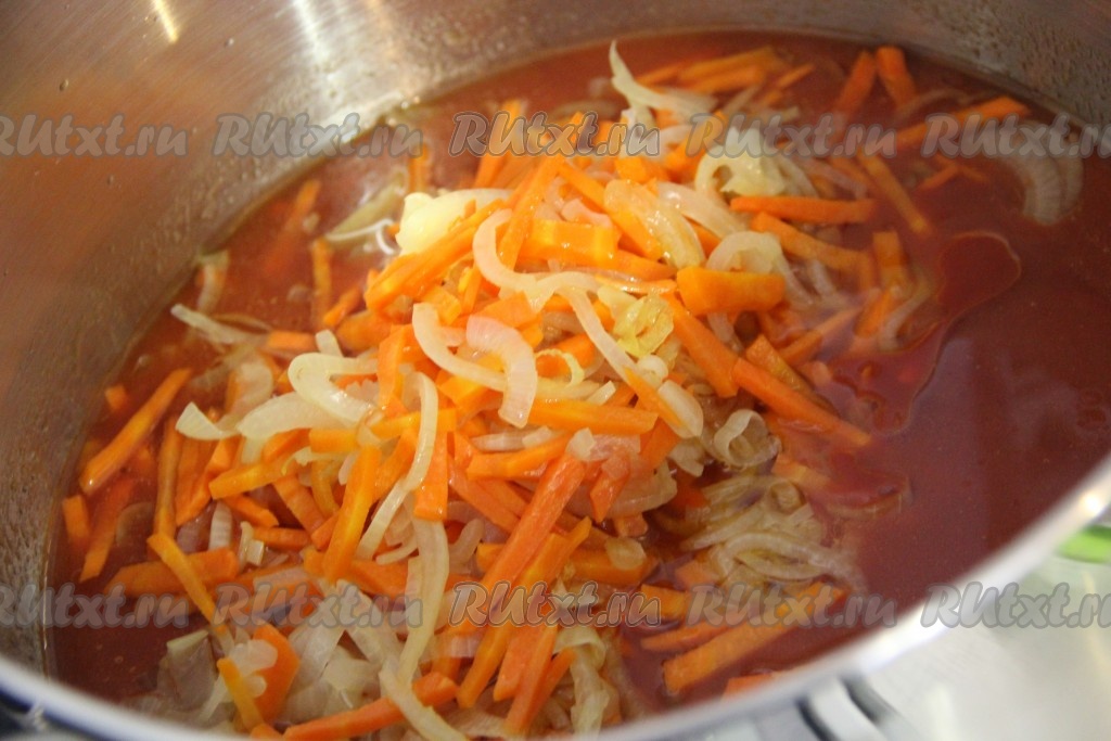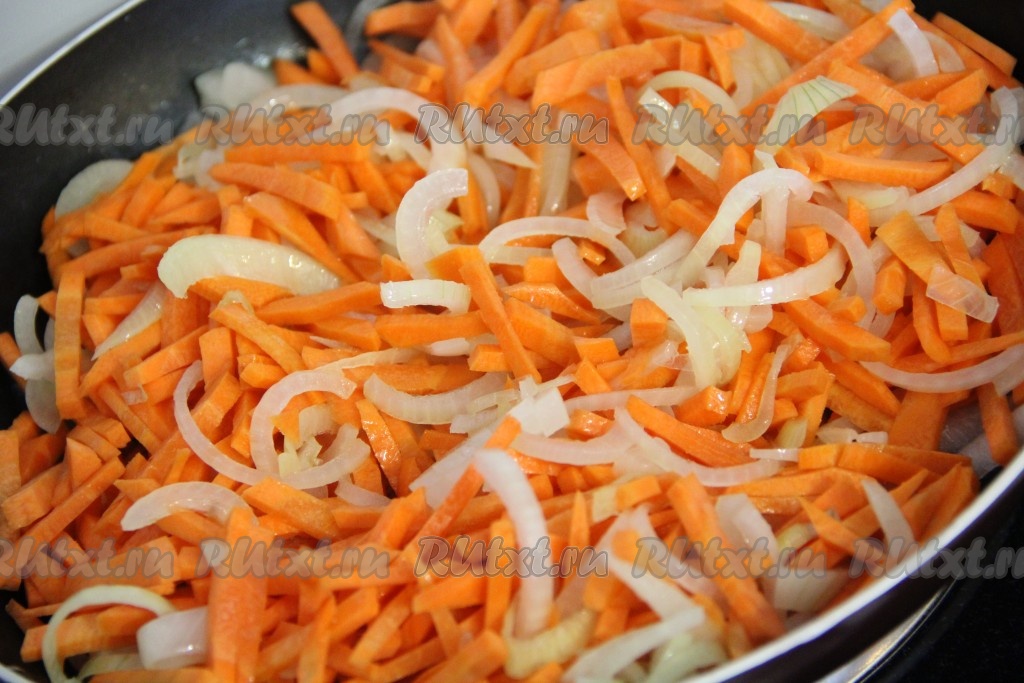 Добавить морковь к луку. Обжарить овощи в течение 10 минут, периодически перемешивать.