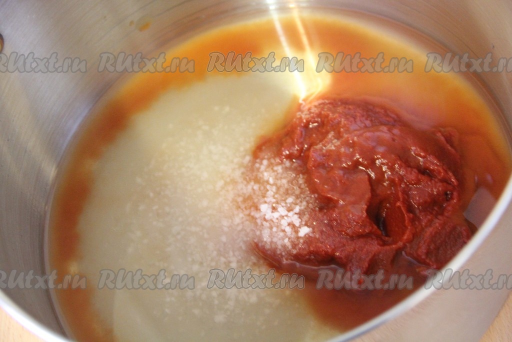В большую кастрюлю (я готовила салат из кабачков в кастрюле объёмом 7 литров) влить воду, добавить томатную пасту, сахар, соль. Всё перемешать и поставить на огонь.