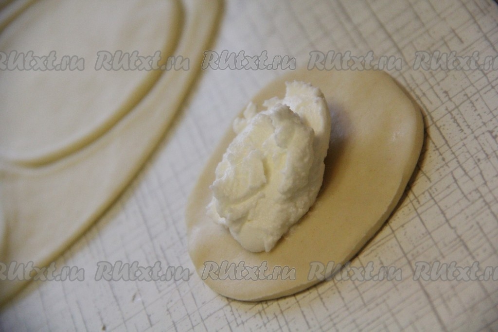 На середину теста выложить немного творожной начинки.