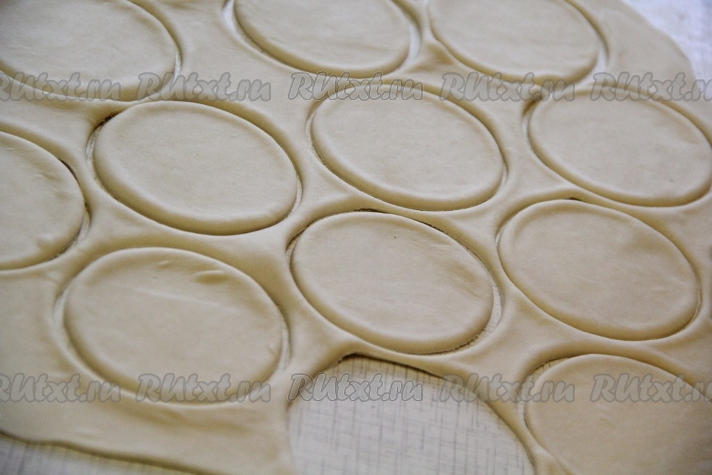 Раскатать тесто скалкой в большой пласт. Вырезать из теста кружочки с помощью тонкого стакана. Размер вареников определяйте сами.