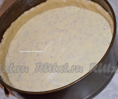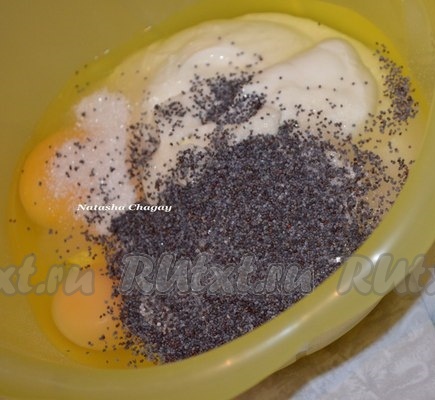Для приготовления заливки взбить вилкой сметану с яйцами, маком, сахаром, ванилином. Начинка получится достаточно жидкой.