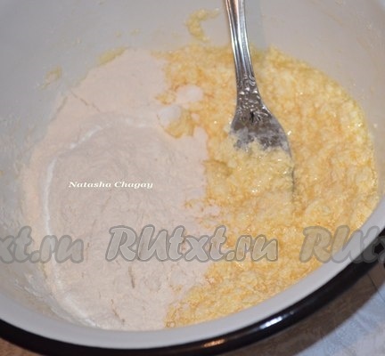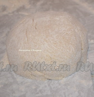 В полученную массу добавить 150 грамм муки, перемешать. Затем, постепенно добавляя оставшуюся муку, замесить тесто. Долго замешивать тесто не надо, оно должно получиться мягким.