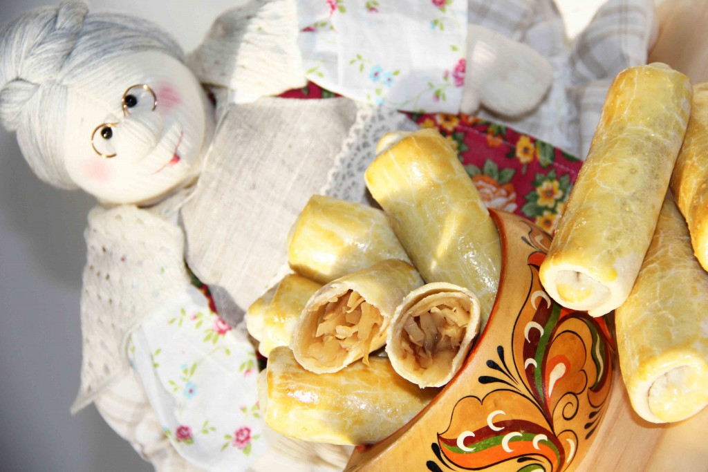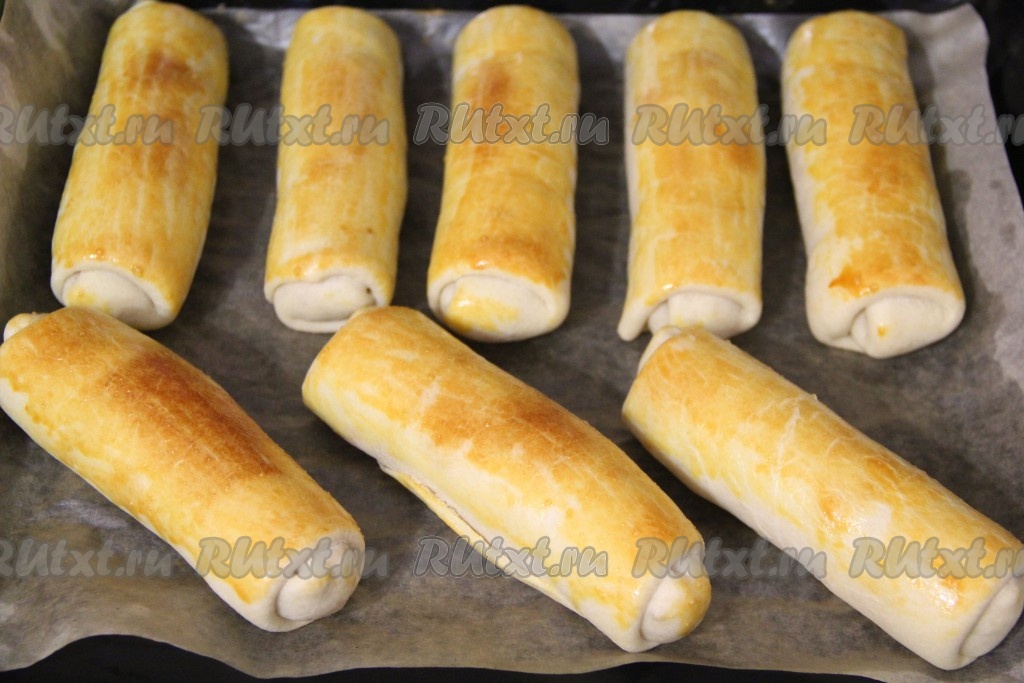 Плотно завернуть начинку в тесто, в виде трубочки.