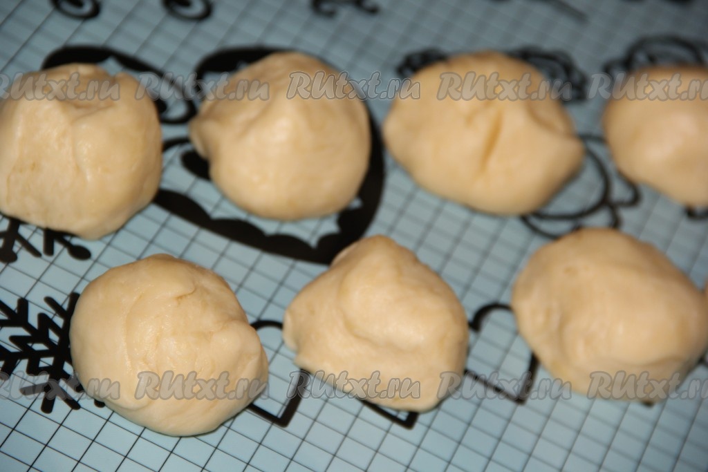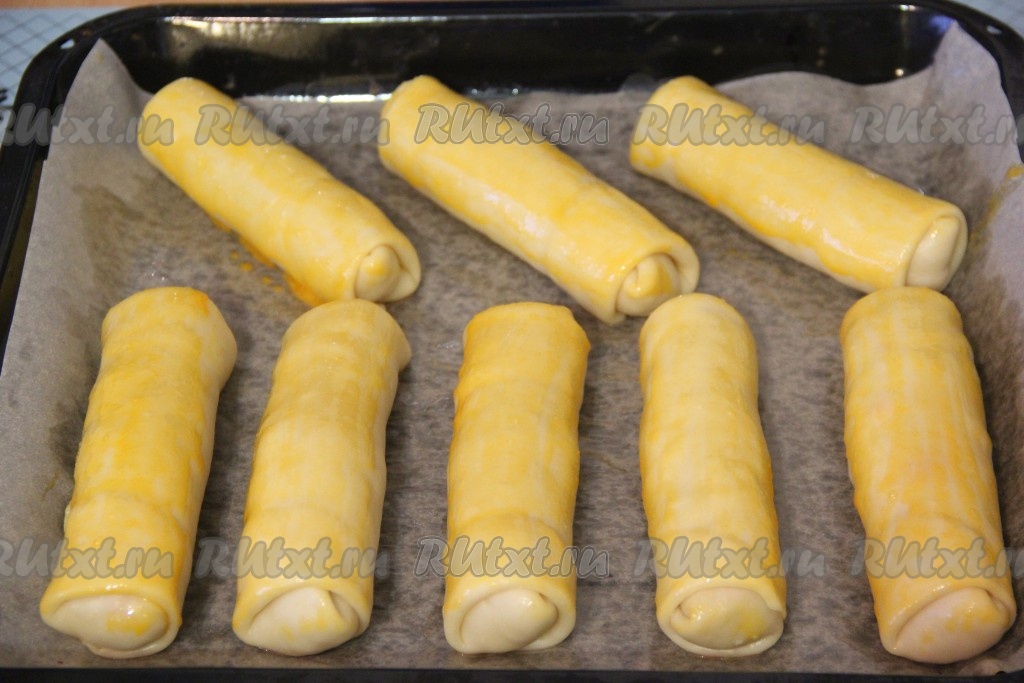 Противень для выпекания застелить пергаментной бумагой. Выложить получившиеся пирожки на противень. Яичный желток слегка взбить вилкой. Смазать верх пирожков желтком.