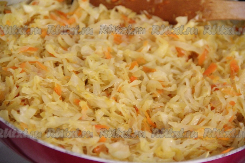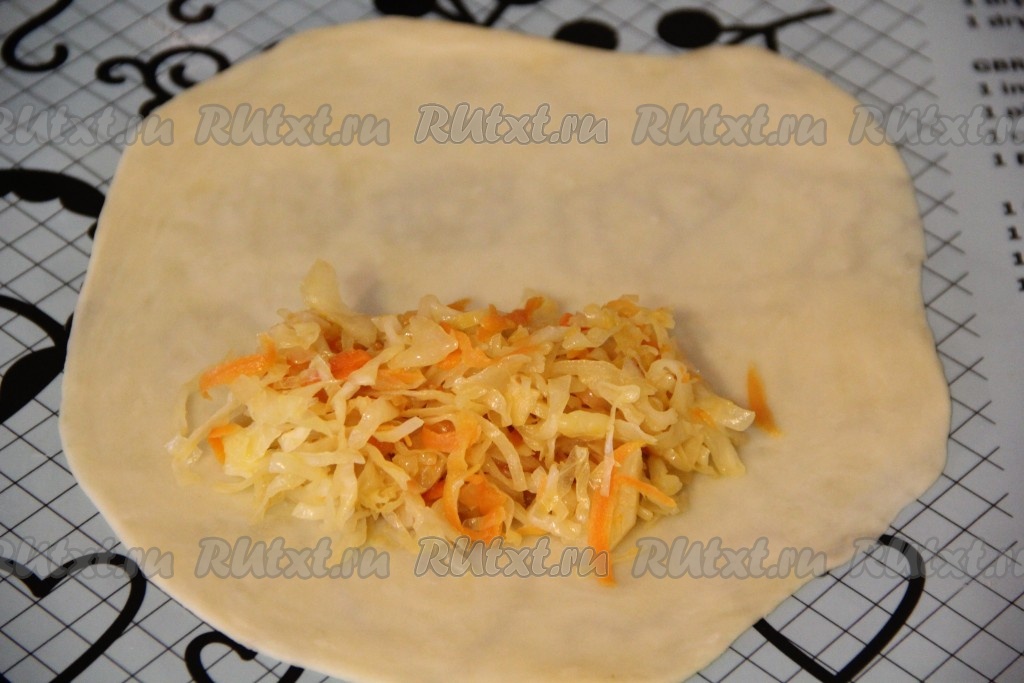Для начала приготовить начинку: капусту тонко нашинковать. Морковь почистить и натереть на крупной тёрке. В сковороду влить масло и добавить морковь, слегка обжарить. Затем добавить капусту. Хорошо перемешать и жарить капусту в течение 15 минут при помешивании, затем посолить, поперчить. Снять сковороду с огня и немного остудить начинку.