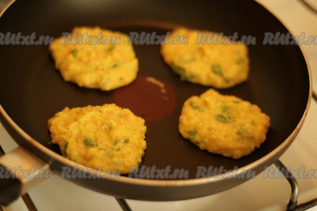 Берём ложкой небольшое количество полученной смеси и обжариваем наши диетические оладушки на сухой сковородке с двух сторон по 2-3 минуты с каждой стороны.