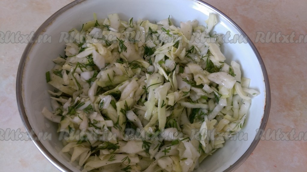 9. Еще к капусте я добавляю мелко нарезанный укроп. Ставлю в холодильник к огурцам.