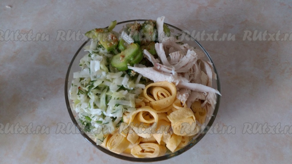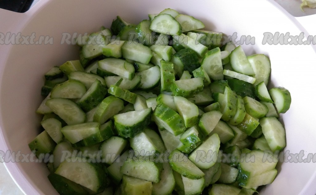 2. Пока грудка варится, готовим салаты и блинчики. Вначале я нарезаю огурцы, потом все солю, перчу, добавляю чуток сахара и уксуса, хорошенько перемешиваю.