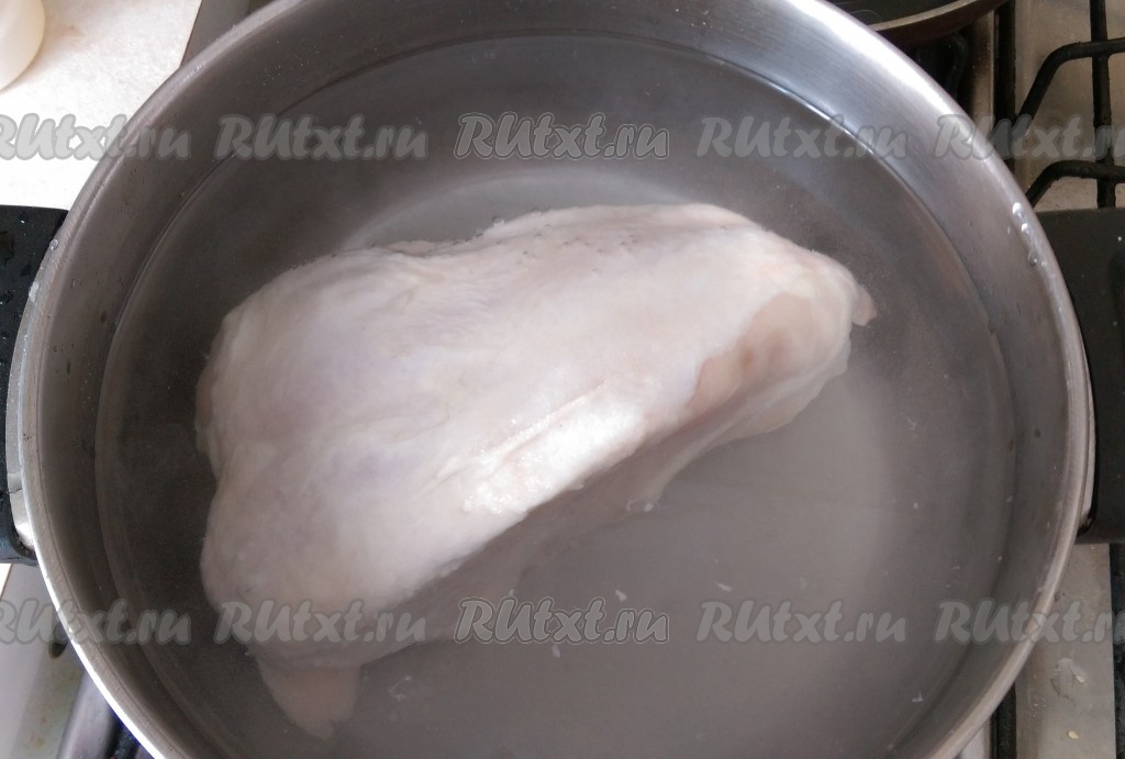 1. Грудку ставим вариться в подсоленной воде. И отдельно варим лапшу, как указано на пачке, в соленой воде.