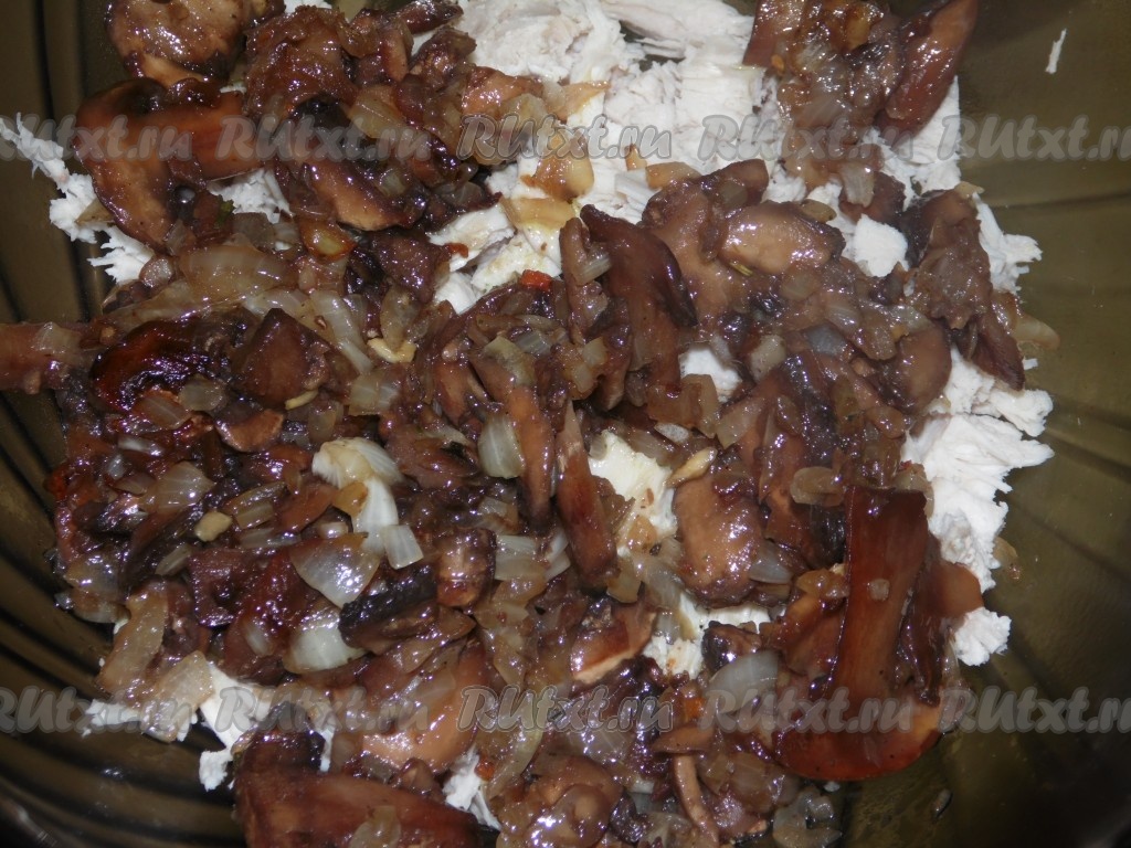 Обжаренные до готовности грибы с луком остудить и добавить к куриной грудке.