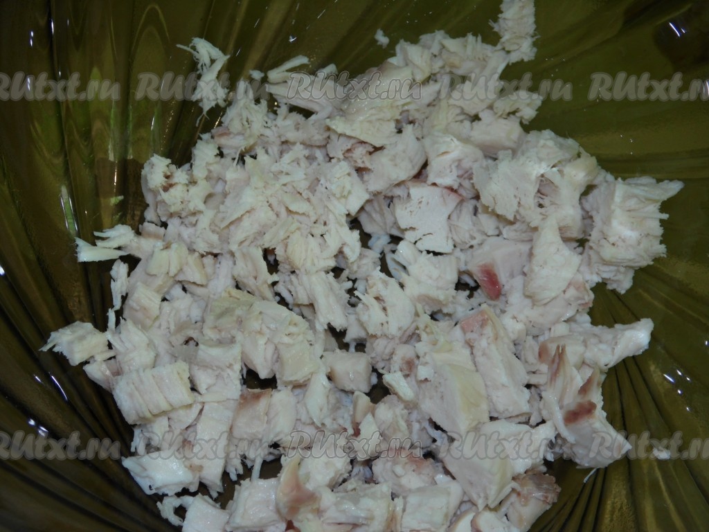 Куриную грудку залить холодной водой, довести до кипения, уменьшить огонь, снять пену и отварить в течение 15-20 минут (я соль не добавляла). Готовое мясо нарезать на маленькие кусочки.