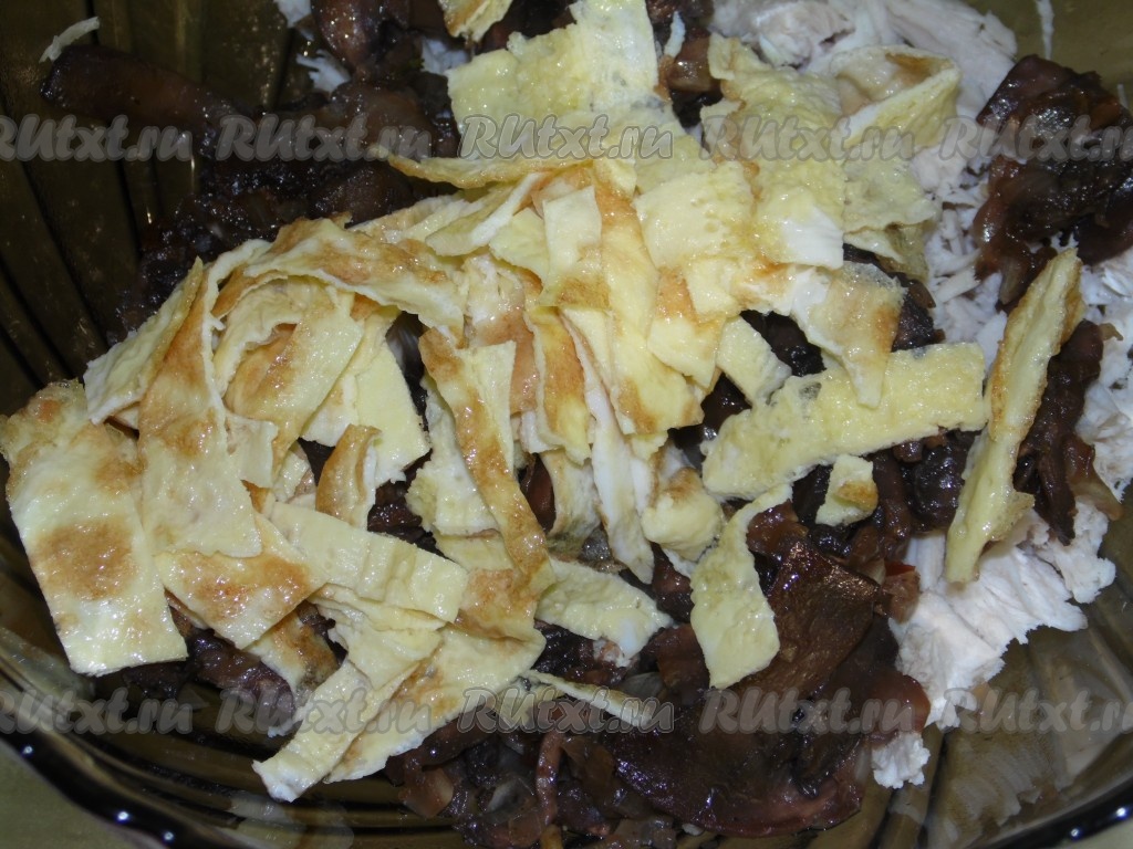 Яичные блинчики свернуть рулетиком, нарезать лапшой и добавить к салату из курицы и грибов.