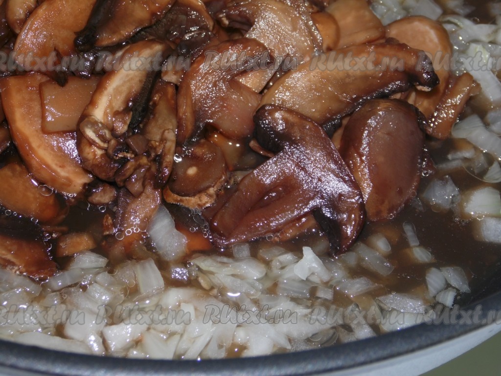 Очищенный репчатый лук нарезать маленькими кубиками и обжарить на растительном масле, помешивая, до лёгкого румянца. Мелко нарезанные грибы добавить к обжаренному луку и готовить, помешивая, на маленьком огне в течение 7-10 минут.