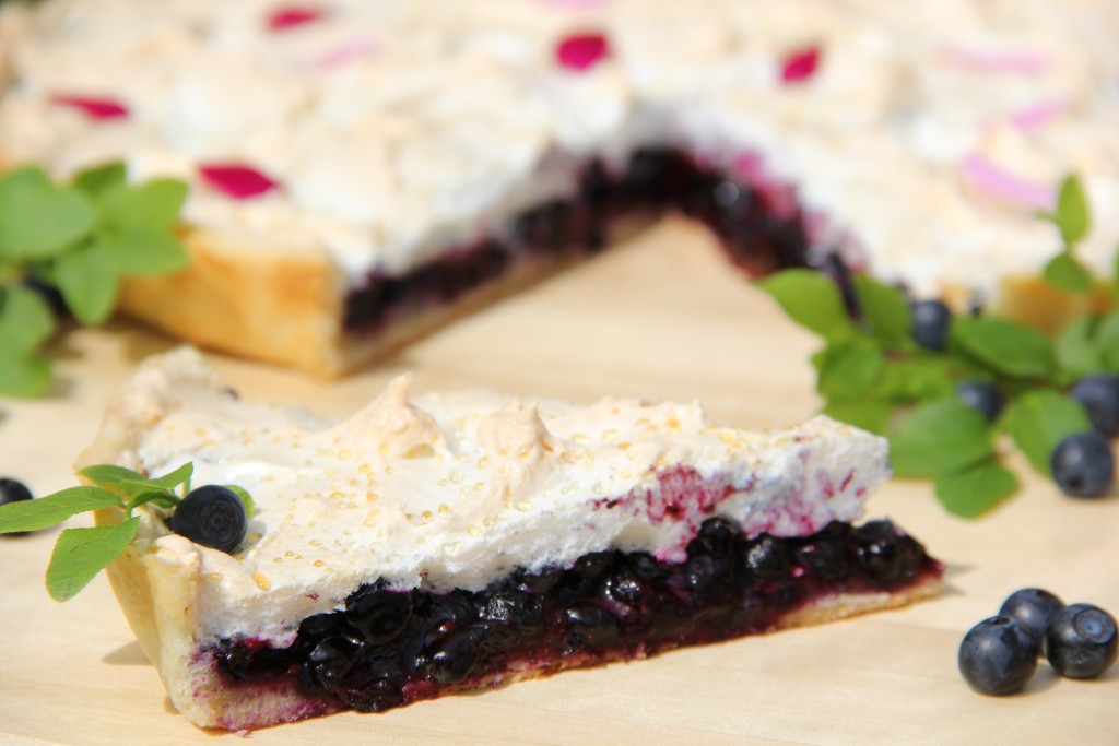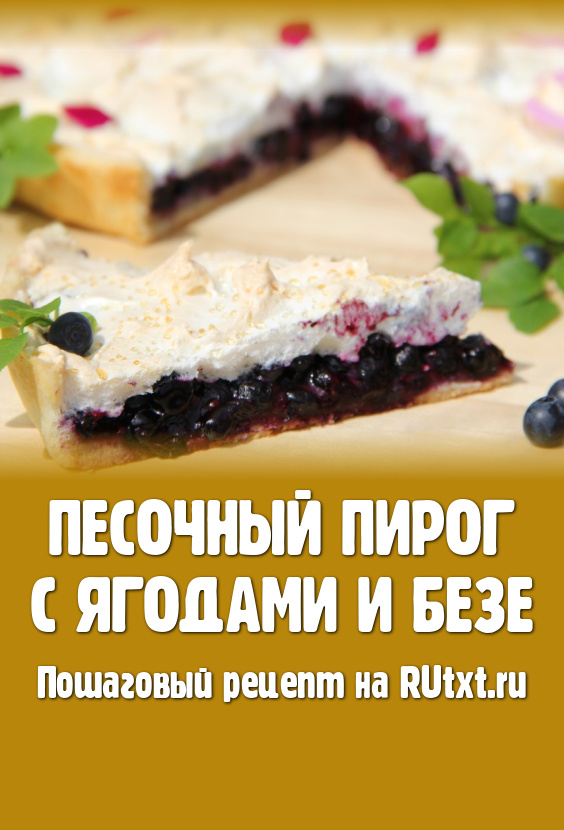 Нарезать на порционные кусочки и подать к столу сочный, ароматный песочный пирог с ягодами и безе.