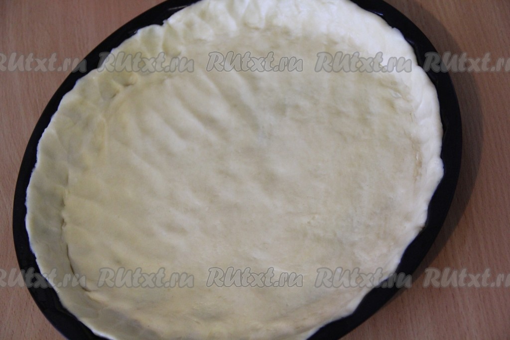 Готовое тесто достать из холодильника, освободить от пищевой плёнки и выложить в форму для выпекания. Аккуратно распределить тесто по форме, сформировать бортики. Я взяла форму диаметром 22 см, слегка смазала её растительным маслом.