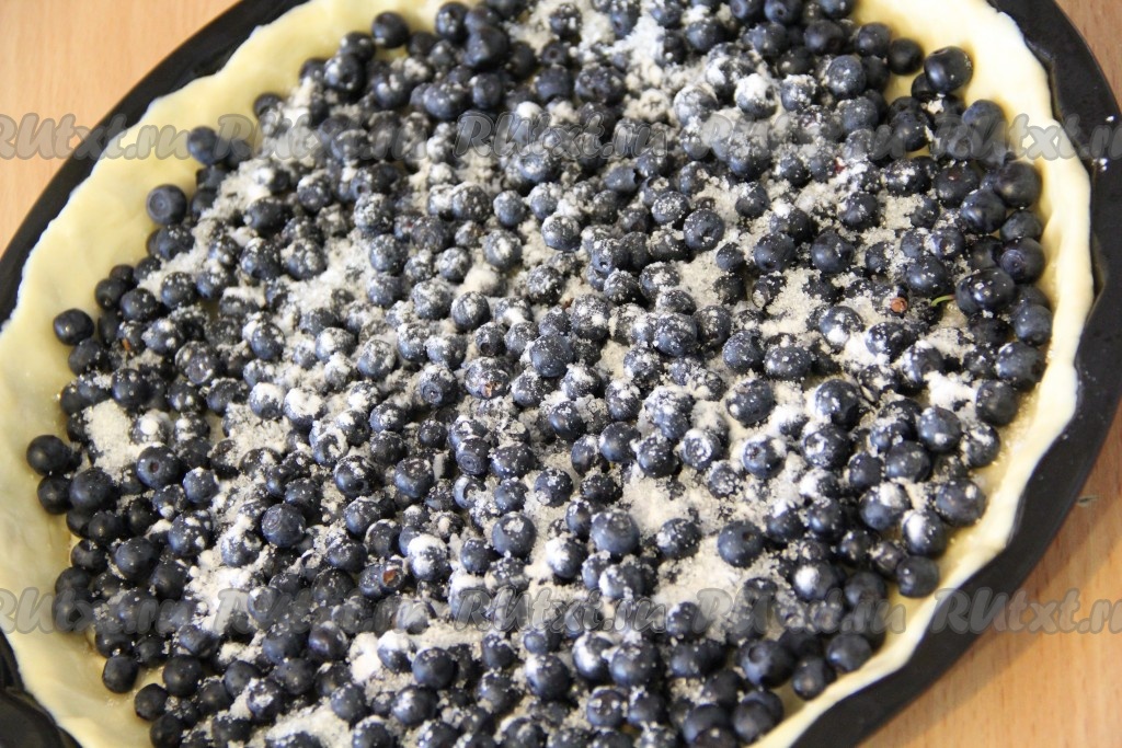 Ягоды вымыть под проточной водой, откинуть на дуршлаг, чтобы стекла лишняя вода. Если ягоды замороженные, их нужно разморозить и слить лишнюю жидкость. Затем выложить ягоды на тесто, разровнять и присыпать крахмалом.