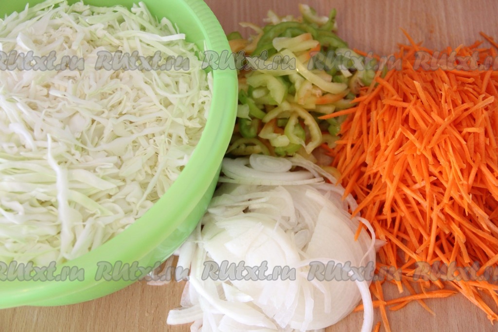 Очистить лук и морковь. Перец освободить от семян и плодоножек. Тонко нашинковать капусту. Морковь натереть на тёрке для корейской моркови (или на крупной тёрке). Нарезать лук тонкими полукольцами, перец - тонкими полосками.