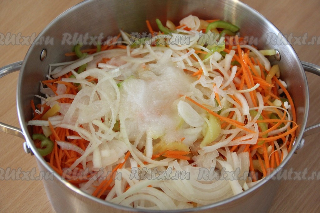Соединить нарезанные овощи в большой кастрюле, хорошо перемешать, добавить растительное масло, уксус, соль, сахар и ещё раз перемешать.
