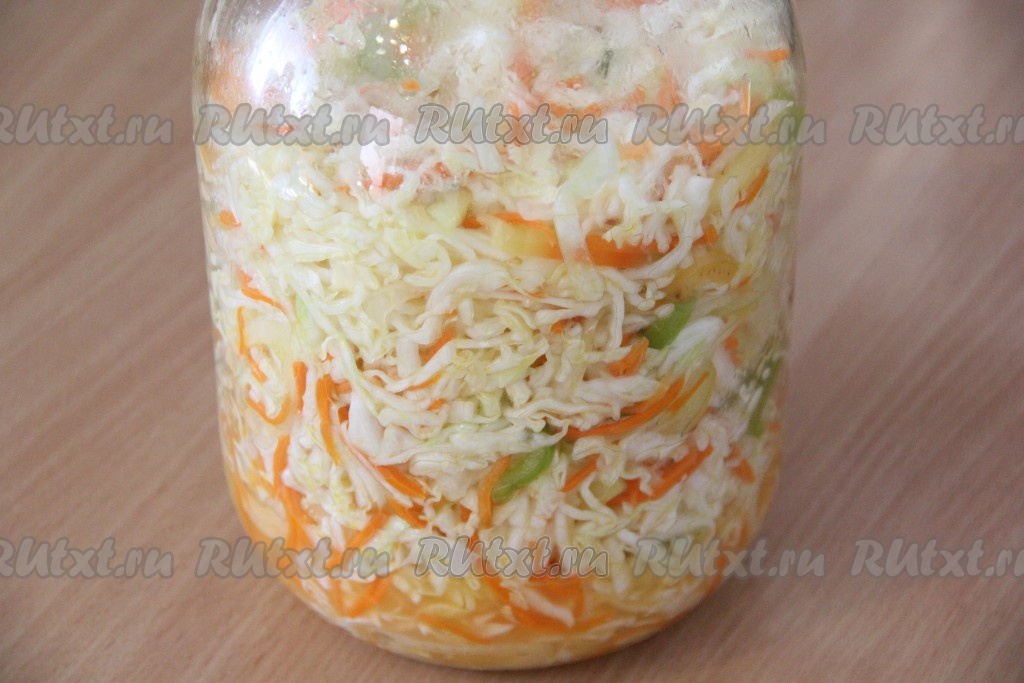 Через сутки аппетитную, хрустящую маринованную капусту "Провансаль" можно подать к столу. По желанию перед подачей можно посыпать нарезанной зеленью или зелёным луком.