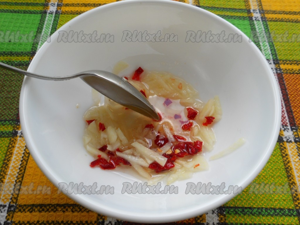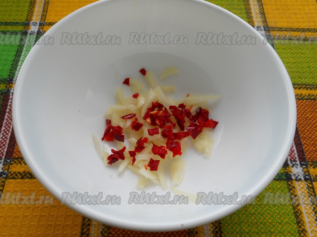 Чеснок очистить и нарезать мелкой соломкой, добавить измельченный острый перец.