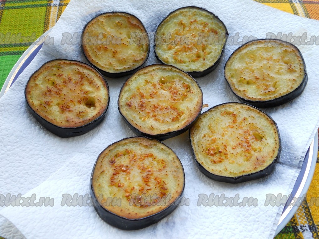 Затем баклажаны обсушить салфеткой и обжарить на подсолнечном масле до румяности с двух сторон. Выложить баклажаны на салфетку для удаления лишнего жира.