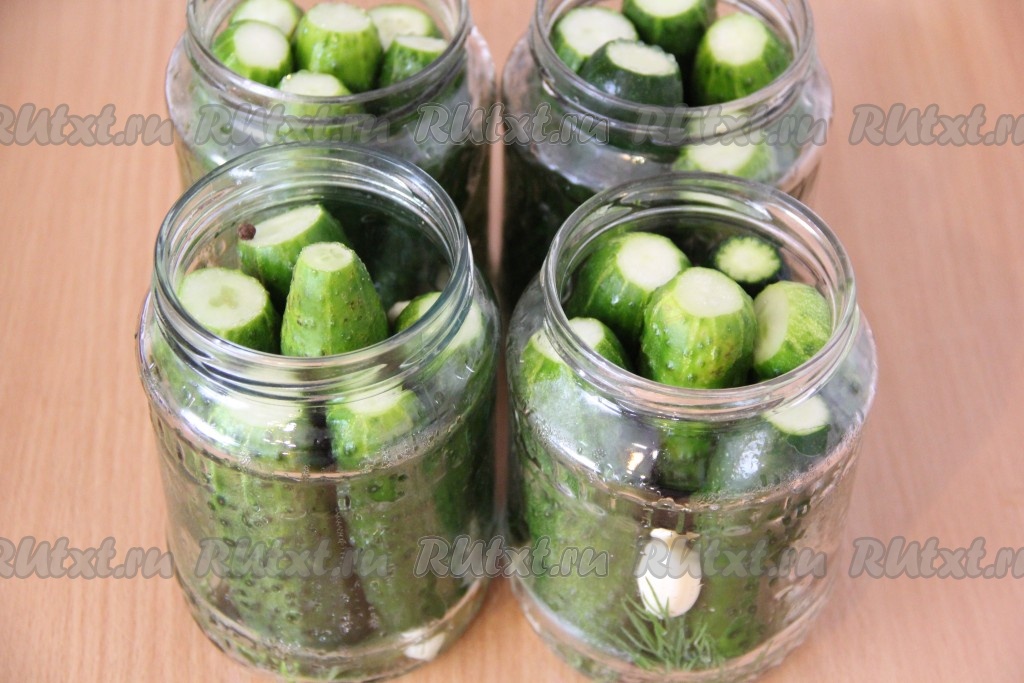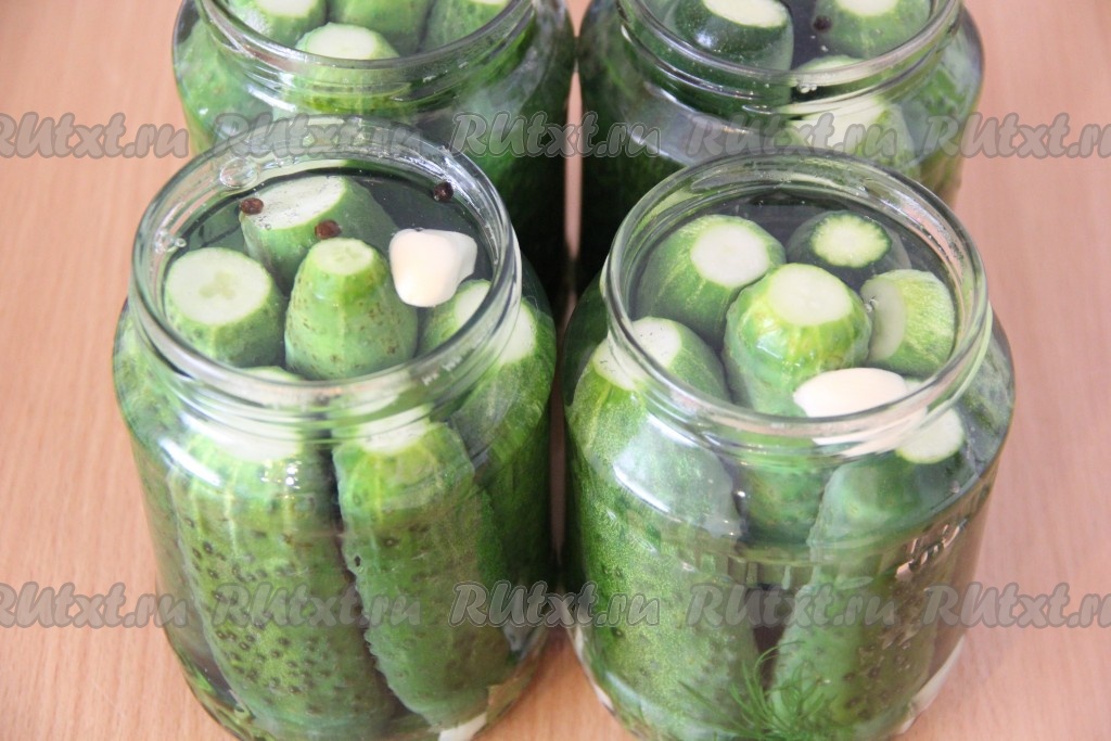 Затем аккуратно слить воду из банок в кастрюлю. Поставить воду на огонь и довести до кипения. Как только вода закипит, снова залить ею огурцы и оставить на 10 минут.