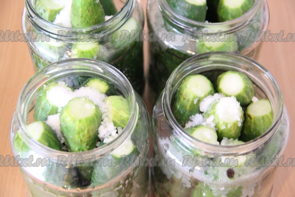 По истечении времени слить воду в кастрюлю и поставить на огонь. Пока наша вода закипает, в банки добавить соль и сахар. Я использую для засолки крупную морскую соль.
