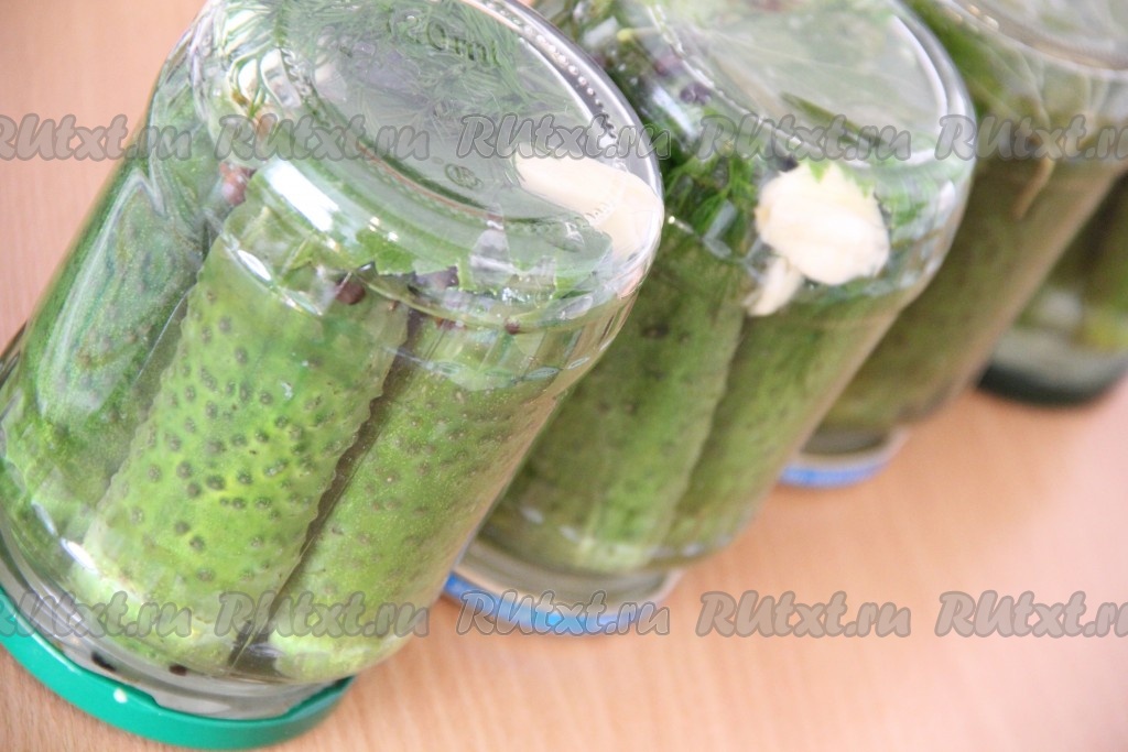 Залить огурцы крутым кипятком, оставив немного места для уксуса и водки. Добавить в банки уксус и водку. Закрыть огурцы винтовыми крышками и перевернуть кверху дном. Укутать банки с огурцами в плед и оставить до полного остывания.