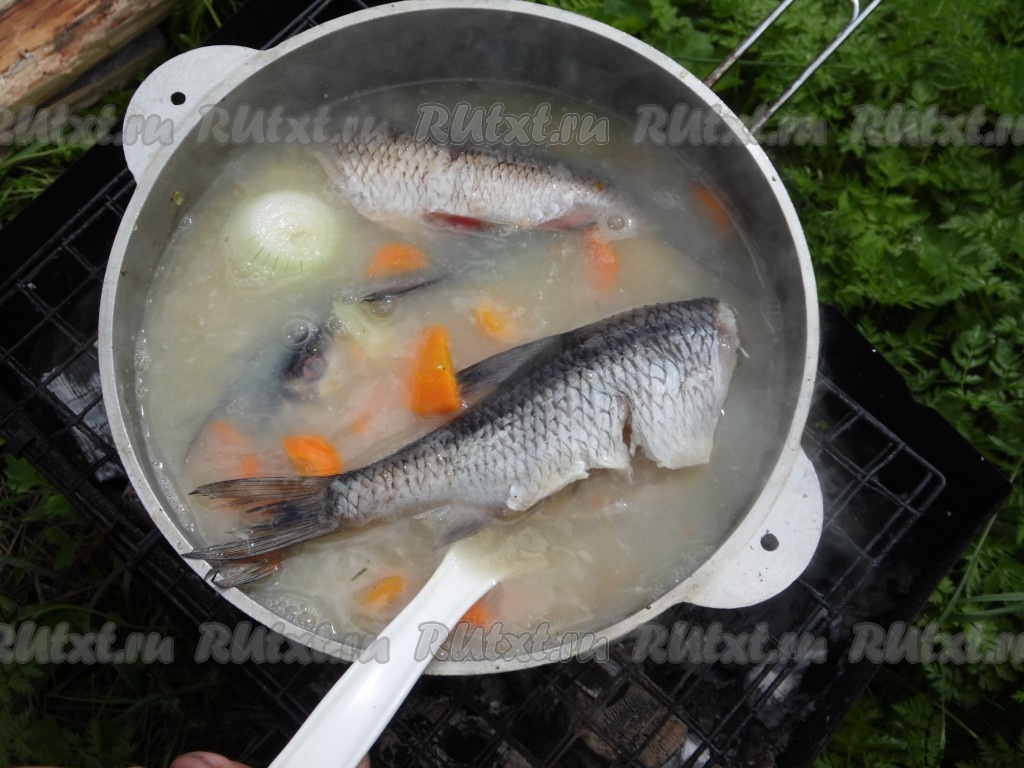Мы готовили уху по простому. В мангале развести костер, поставить решетку. Аналогично можно приготовить этот суп дома, поставив кастрюлю с водой на плиту. В казан с водой добавить картошку, поварить минут 10, добавить нарезанные морковь и лук, соль и специи, поварить еще минут 10.