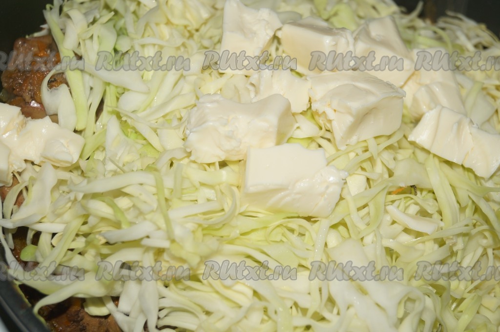 Капусту тонко нашинковать и добавить к печени, тушить под крышкой на маленьком огне (я воду не добавляла) минут 20, периодически перемешивая.
