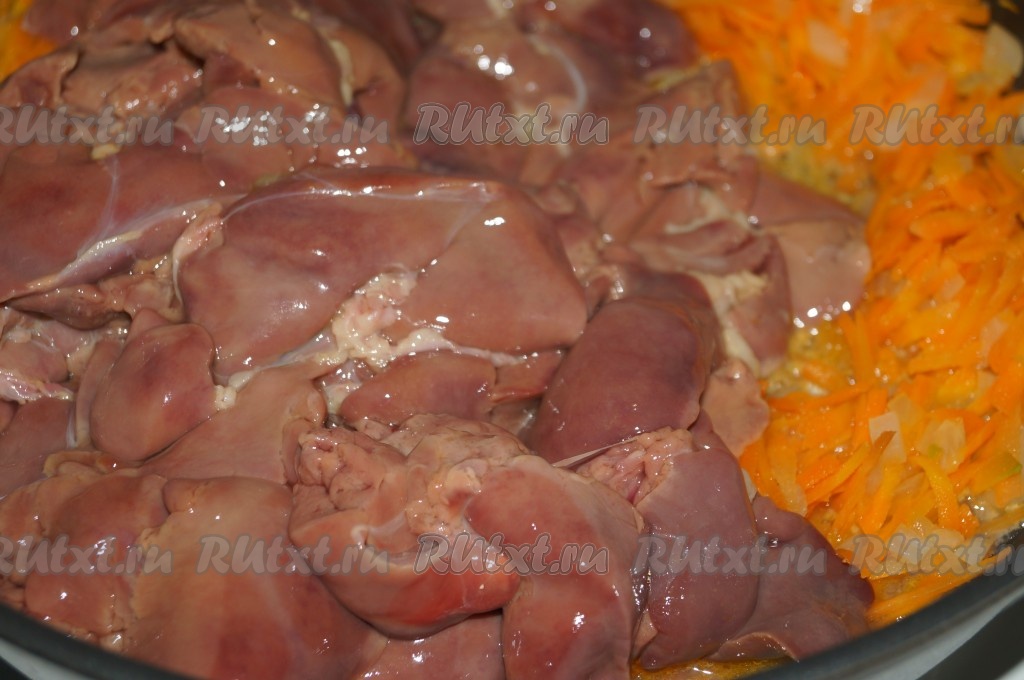Куриную печень промыть, очистить от плёнок и прожилок, нарезать и вместе с солью, специями добавить к обжаренным моркови и луку, перемешать. Жарить до полуготовности печени, примерно 5-7 минут, иногда помешивая.
