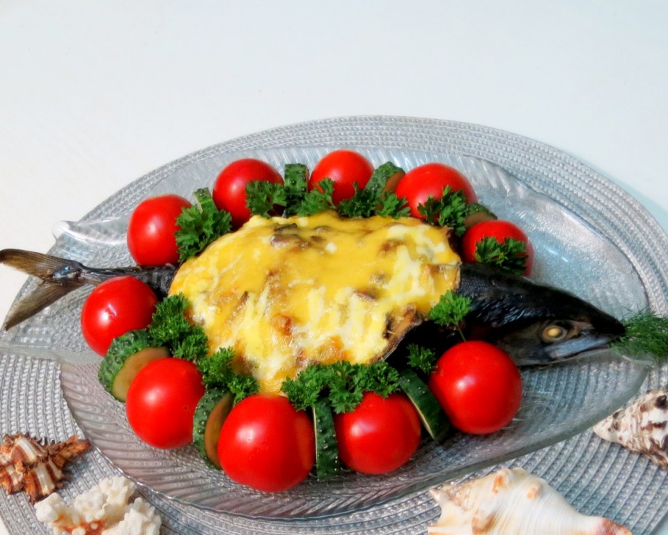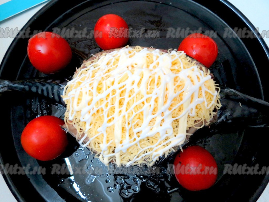 Посыпаем фаршированную скумбрию сверху сыром. Ну а теперь хочу поделиться своими выводами. Чтобы сыр не пересох во время запекания, я всегда сверху поливаю его сеточкой из майонеза. Но если вы противник майонеза, запекайте, использовав только сыр. Рядом с рыбой выложили помидоры, но это к рецепту не относится. Просто зять любит такие. Запекаем скумбрию, фаршированную грибами и сыром, в заранее разогретой до 190 градусов духовке в течение 20 минут.