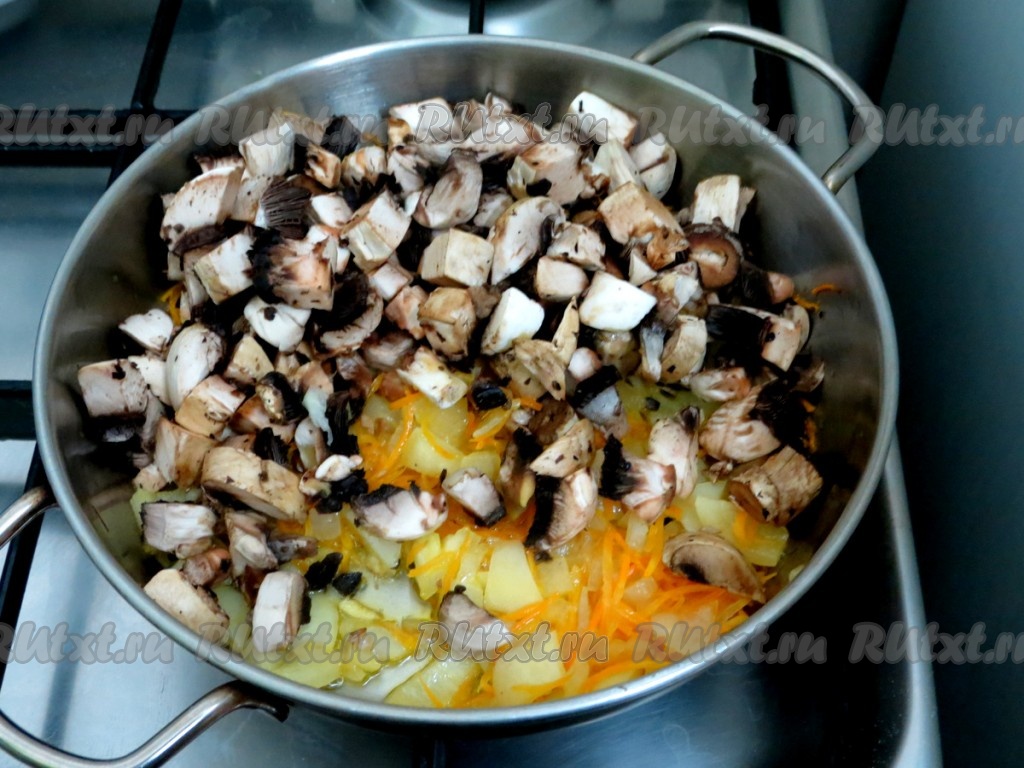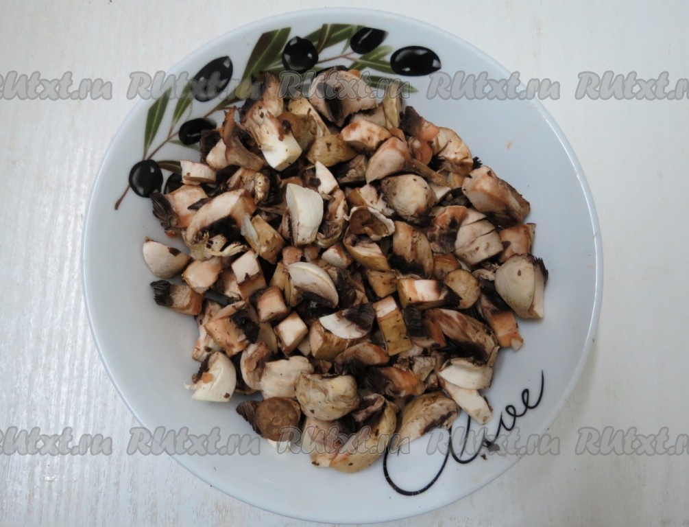 Шампиньоны промываем, обсушиваем, нарезаем на мелкие кусочки.