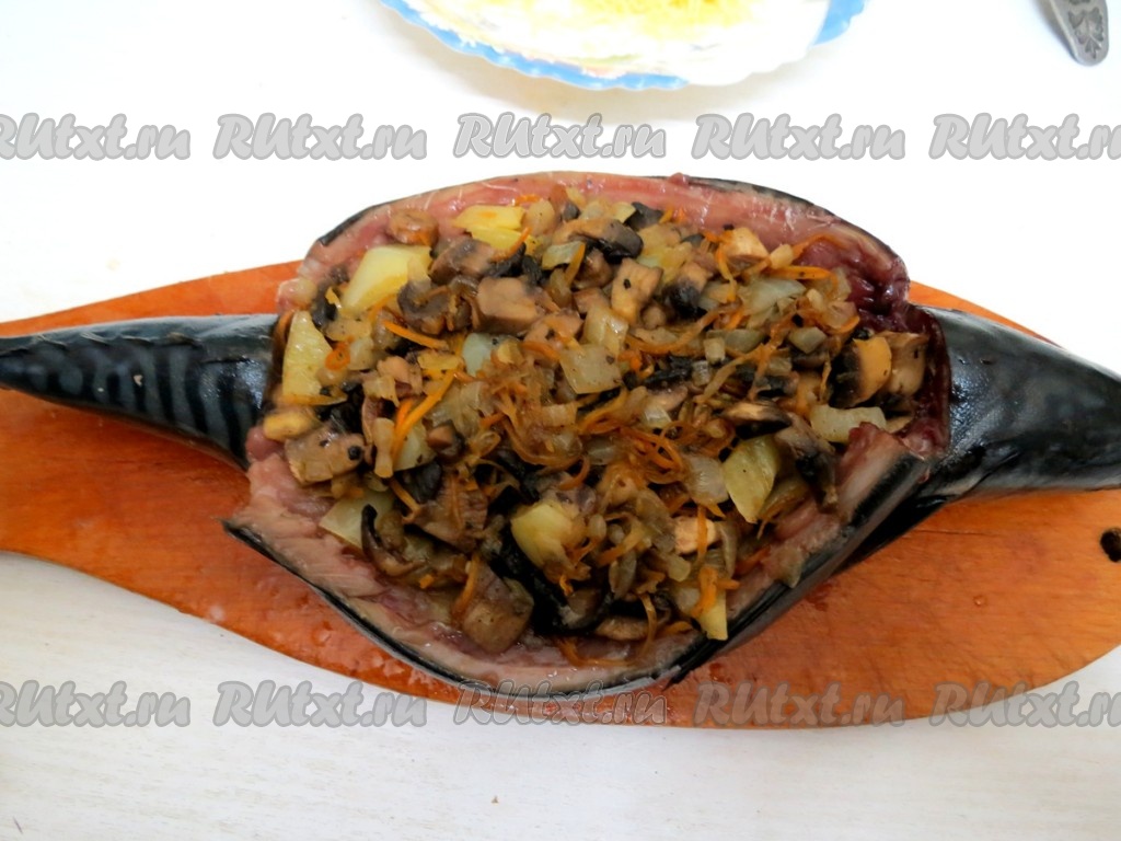 Скумбрию солим, перчим внутри и снаружи, заполняем рыбу начинкой.