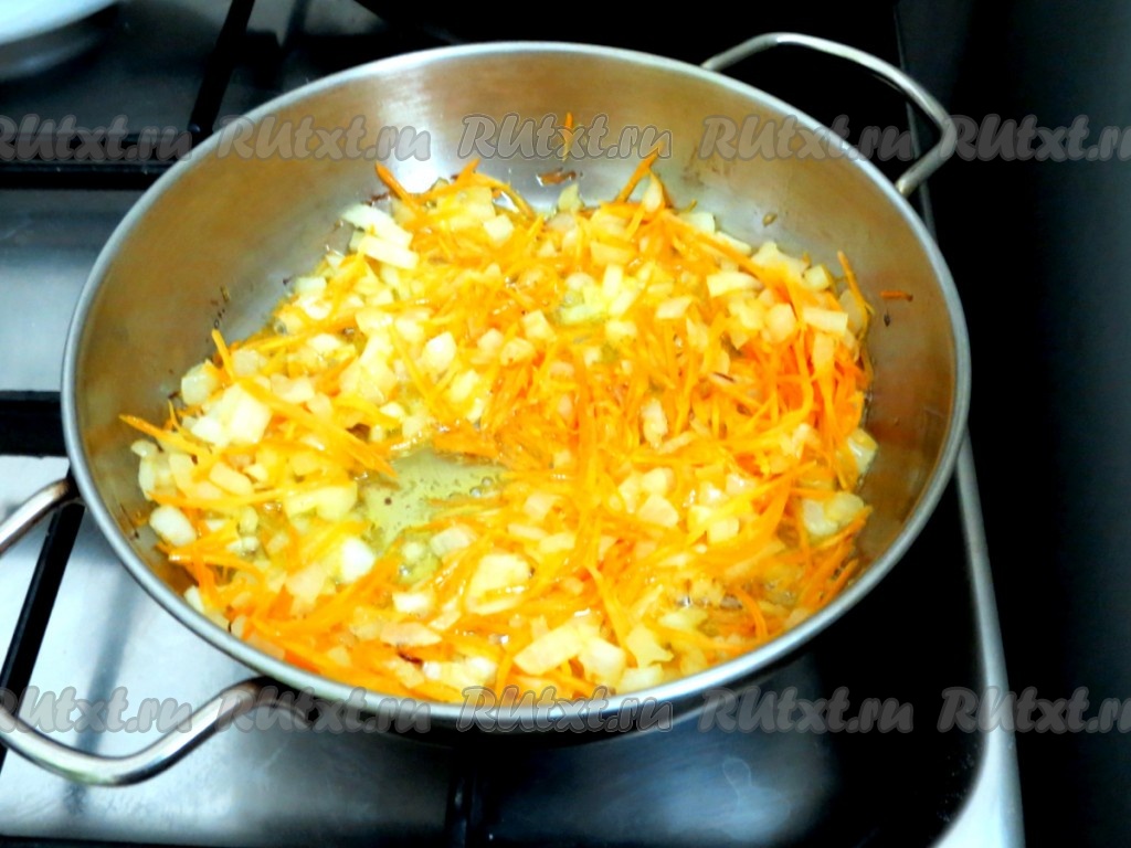 На сковороде разогреваем растительное масло, выкладываем лук с морковью и обжариваем на небольшом огне, иногда помешивая, в течение 3-4 минут.