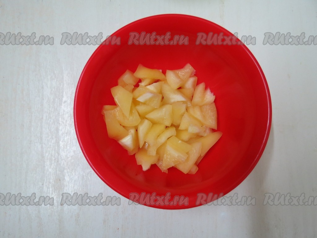 Болгарский перец очищаем от плодоножки с семечками, промываем и нарезаем на мелкие кусочки.