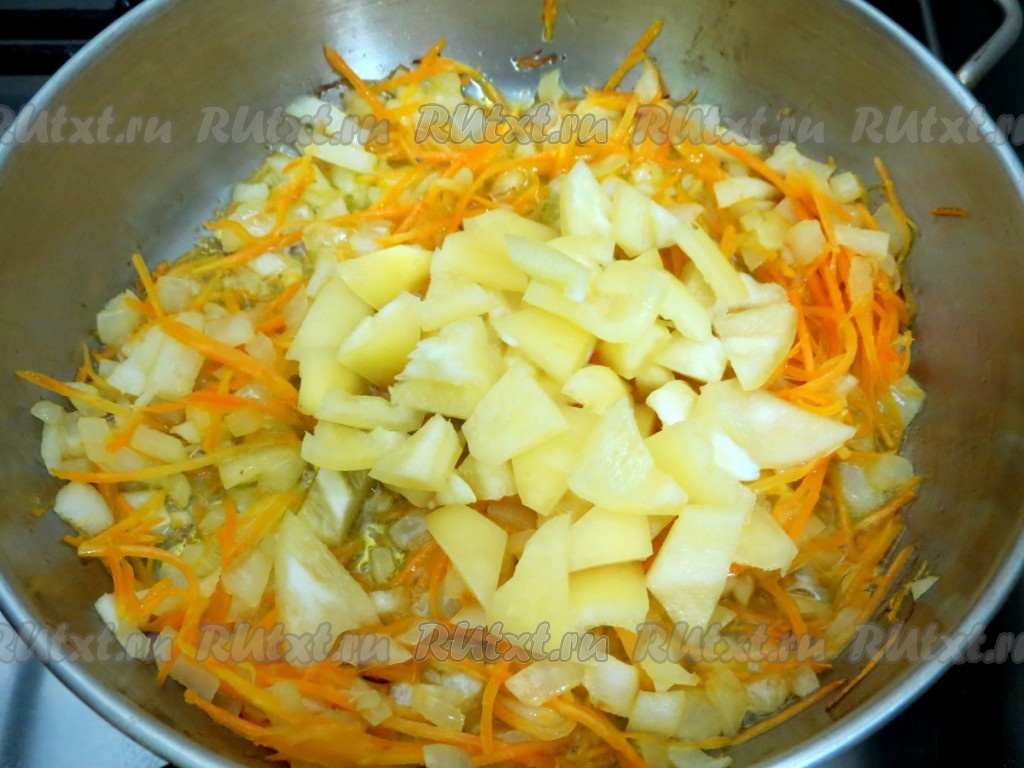 К обжаренным овощам добавляем болгарский перец, обжариваем ещё 2-3 минуты. Если будете готовить без перца, тогда просто обжаривайте морковку с луком 2-3 минуты без перца.