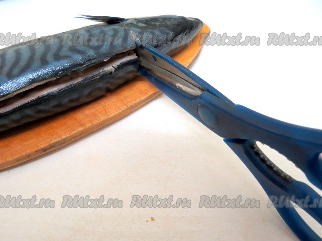 Ножницы вставляем в поперечный разрез и перерезаем ими хребетную кость у головы и у хвоста.
