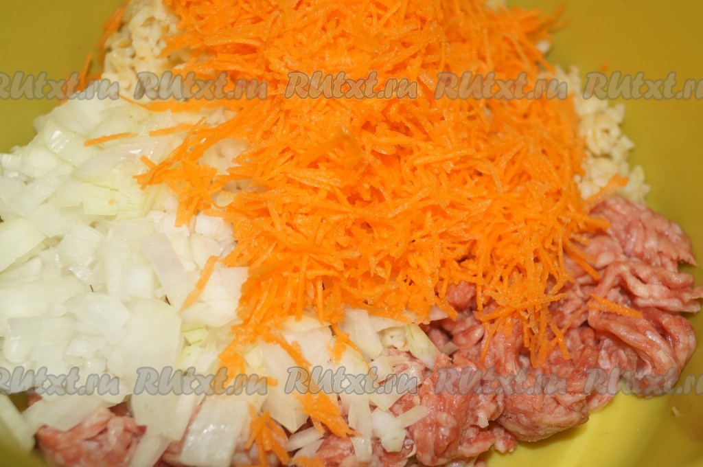 Репчатый лук и морковь очистить. Лук нарезать, как можно мельче, а морковь натереть на мелкой тёрке. Добавить овощи к фаршу с булгуром вместе с солью и специями, перемешать до однородности.