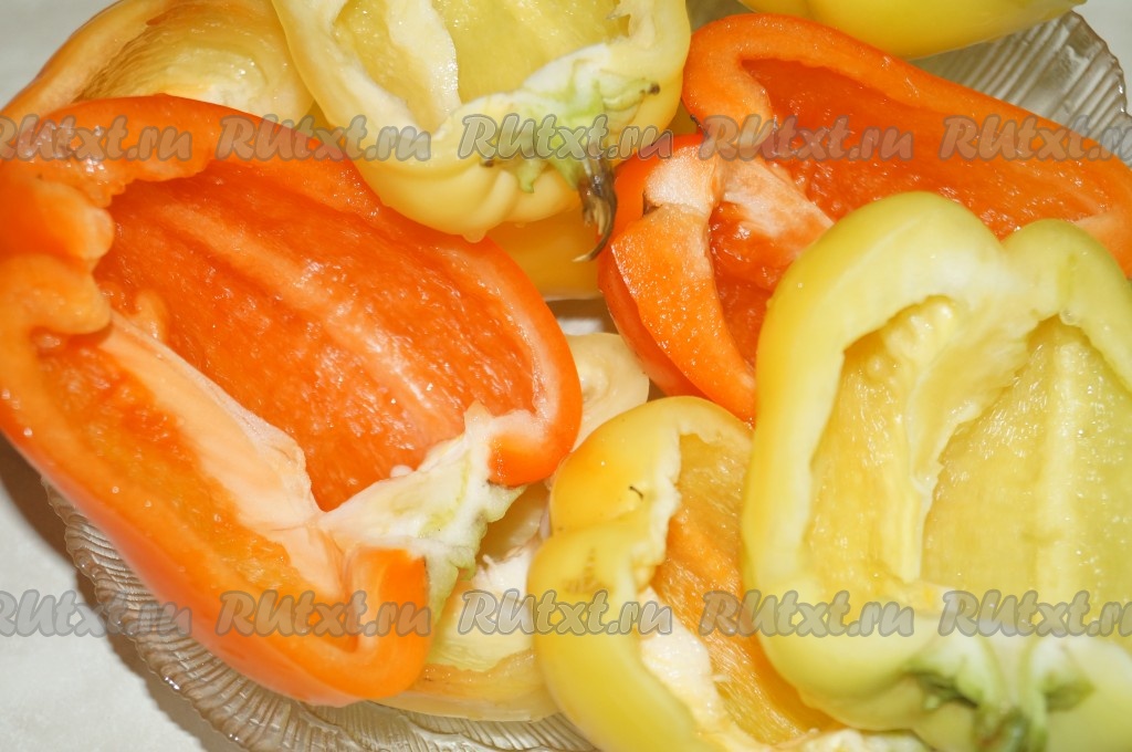 Болгарский перец, разрезанный на половики, очистить от семечек, промыть водой.