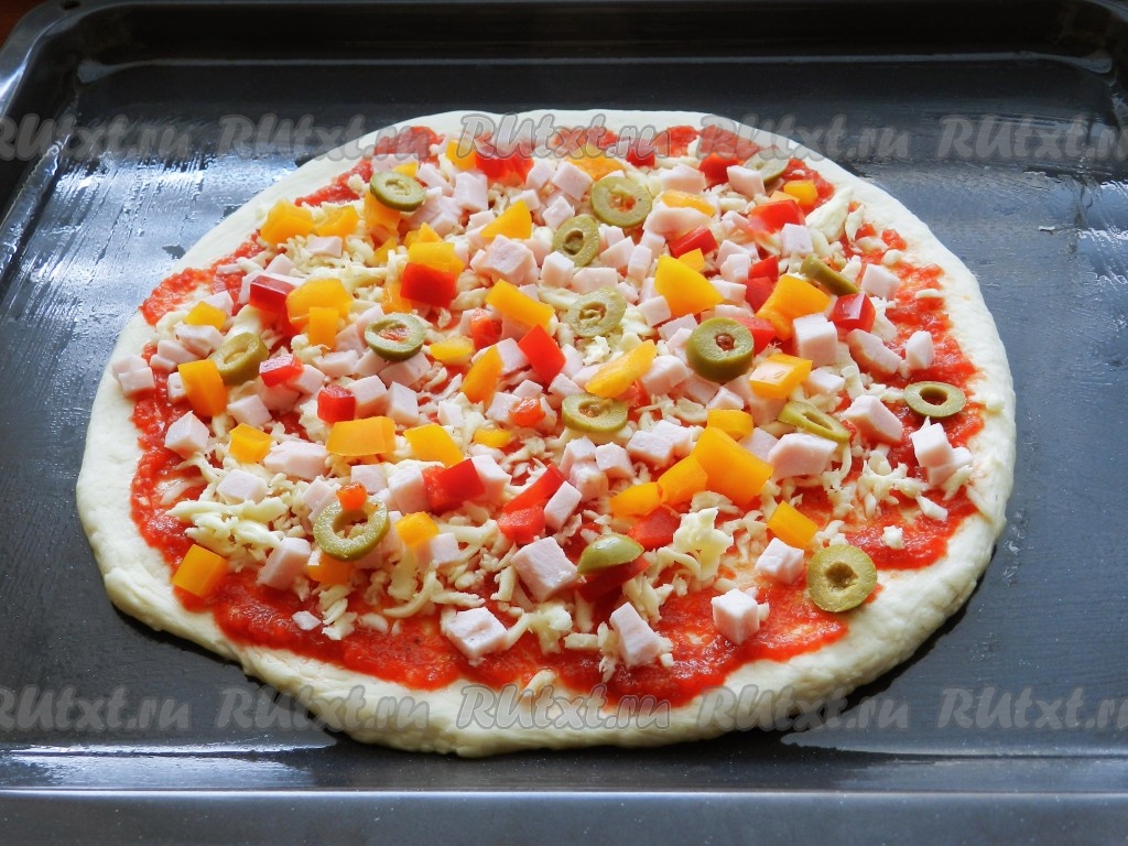 Выпекайте пиццу в разогретой до 200 градусов духовке в течение 15-20 минут.