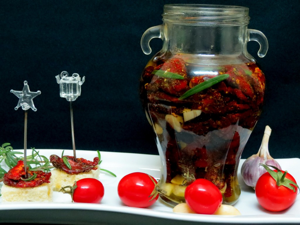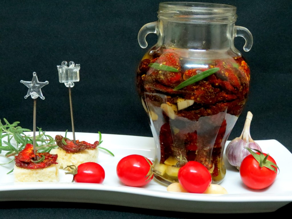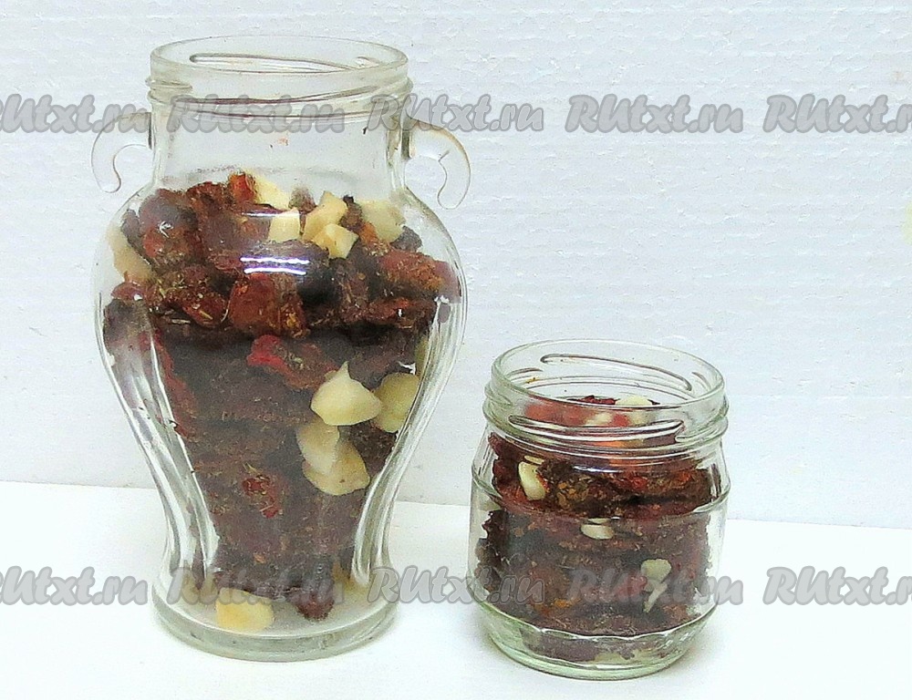 Стерилизуем банки и перекладываем в них вяленые помидоры, пересыпая ломтиками чеснока и иглами розмарина. Можно использовать листья свежего базилика.