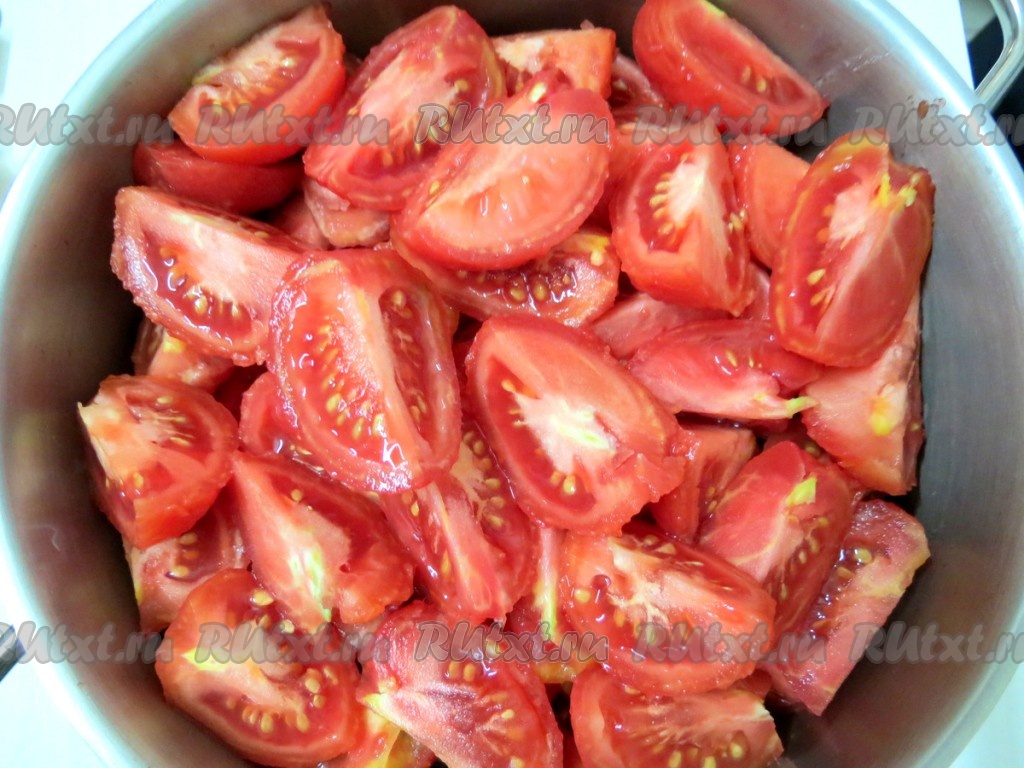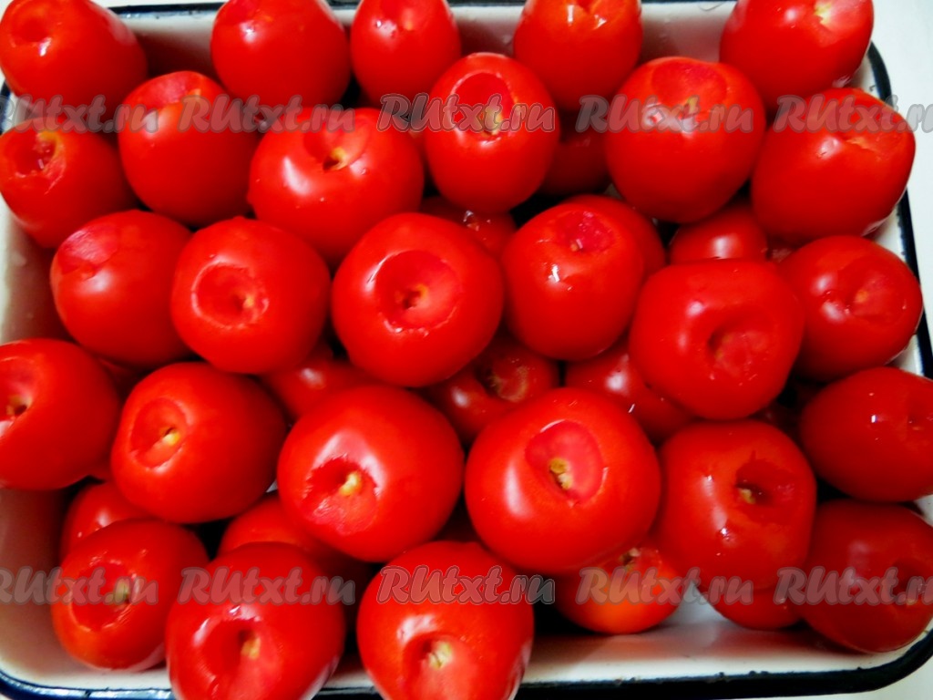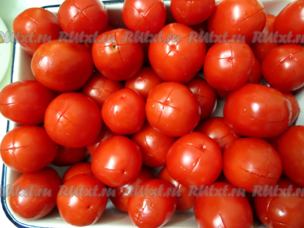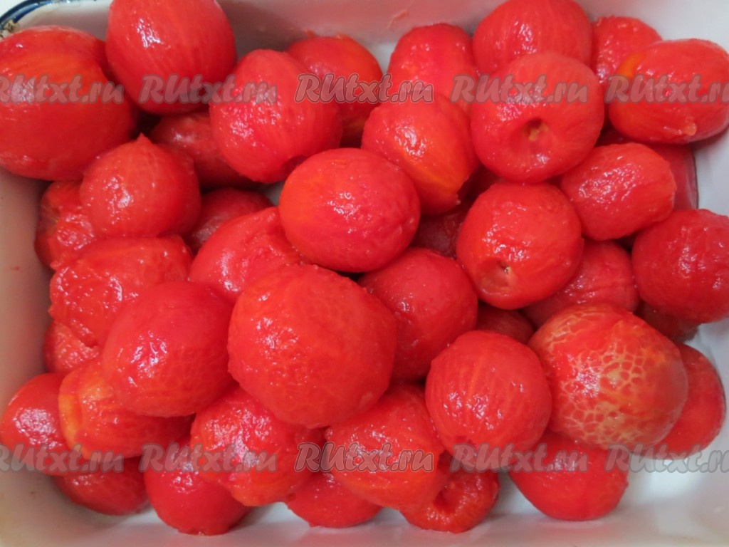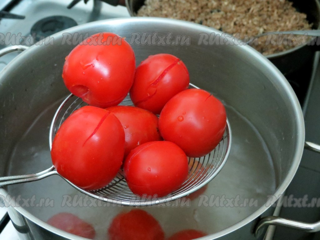 В большую кастрюлю наливаем воду и доводим до кипения. В кипящую воду отправляем на 30 секунд небольшими партиями помидоры (штук по 10). Сразу вынимаем их шумовкой.