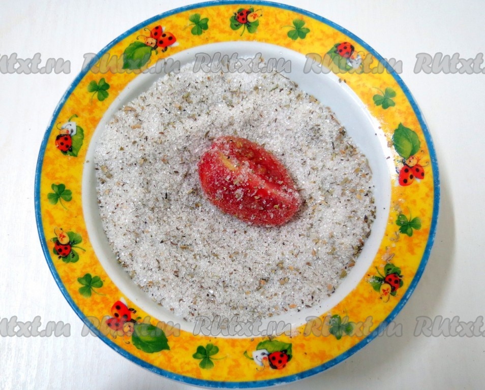 Каждую помидорину обмакиваем в смеси сахара, соли и специй.