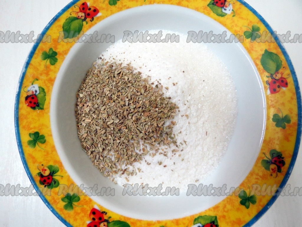 В тарелке смешиваем соль, сахар и специи. Помидор - овощ кислый, в высушенном виде кислота ощущается особенно сильно. Чтобы улучшить вкус помидоров, добавим сахар, к тому же он также является консервантом.