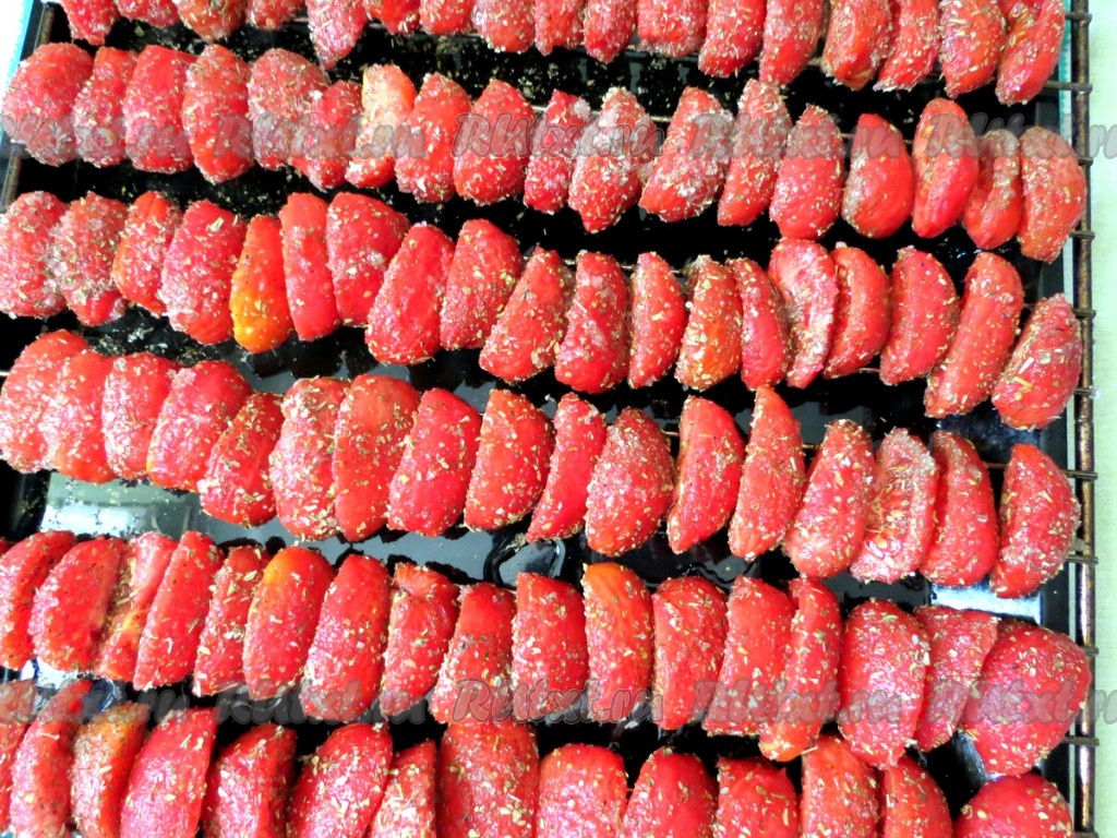 Вяленые помидоры - это "фишка" итальянской кухни. Они воплощают в себе яркий вкус свежих помидоров, а также неповторимое сочетание специй с томатами и оливковым маслом. Единственный их недостаток - это дороговизна. Решила приготовить вяленые помидоры в домашних условиях в духовке. Многие рецепты оказались однотипными, и приготовленные вяленые помидоры совсем не напоминали те, которые я пробовала в Италии и Словении. Кожица напоминала фольгу, помидоры получились не сухими, гибкими и никакими на вкус, во рту оставалась кожица, что довольно-таки неприятно. Методом проб и ошибок, прочитав много рецептов, остановилась на этом рецепте приготовления вяленых помидоров в духовке в домашних условиях. Результат получился просто восхитительным, как раз таким, как и должен быть.