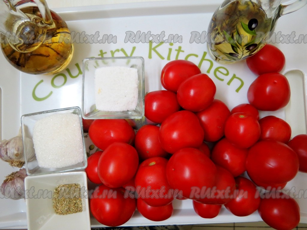 Для приготовления вяленых помидоров нам понадобятся: духовка, помидоры, масло оливковое и растительное, сахар, соль, специи, чеснок, орегано. Специи подбирайте по своему вкусу.